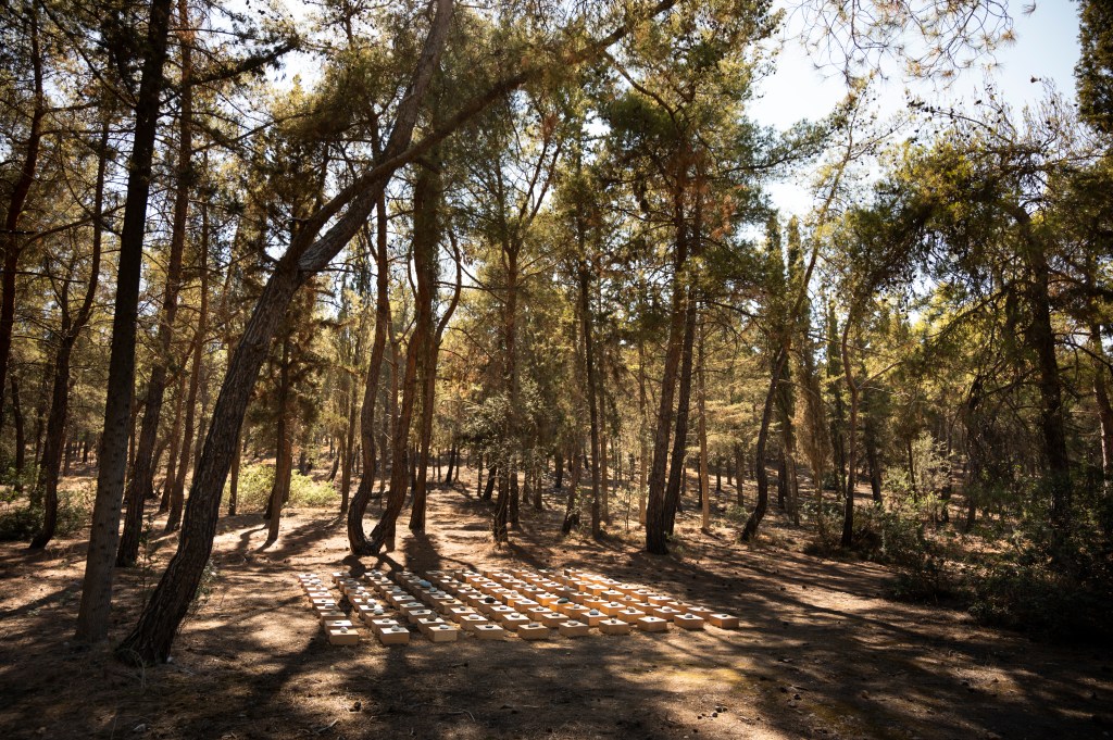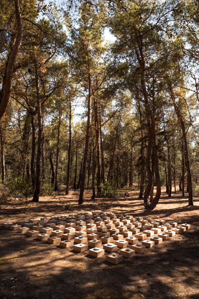 A site specific installation created for the Diomidous Botanical Garden setting. The installation consists of 100 pebbles handpicked and selected by the artist’s father over a period of around 35 years placed on pedestals organized over a strict grid.