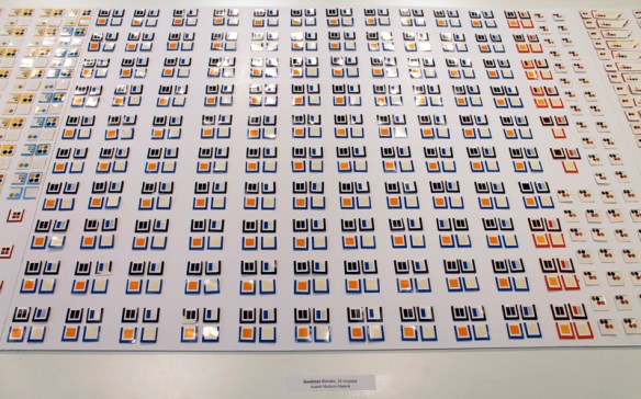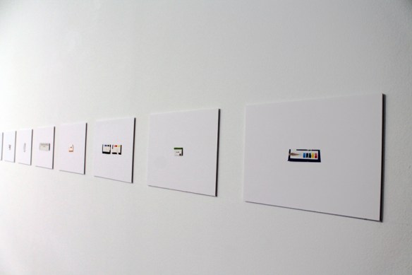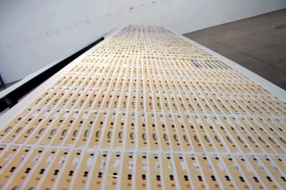 In his new solo show, Dimitris Ioannou presents his extensive collection of calibration marks that one finds on the packages of various products. These images are used in order to control colour quality of printers that are used for packaging using the offset method. They originate from a wide range of retail products, such as cigarettes, food as well as electronic devices.