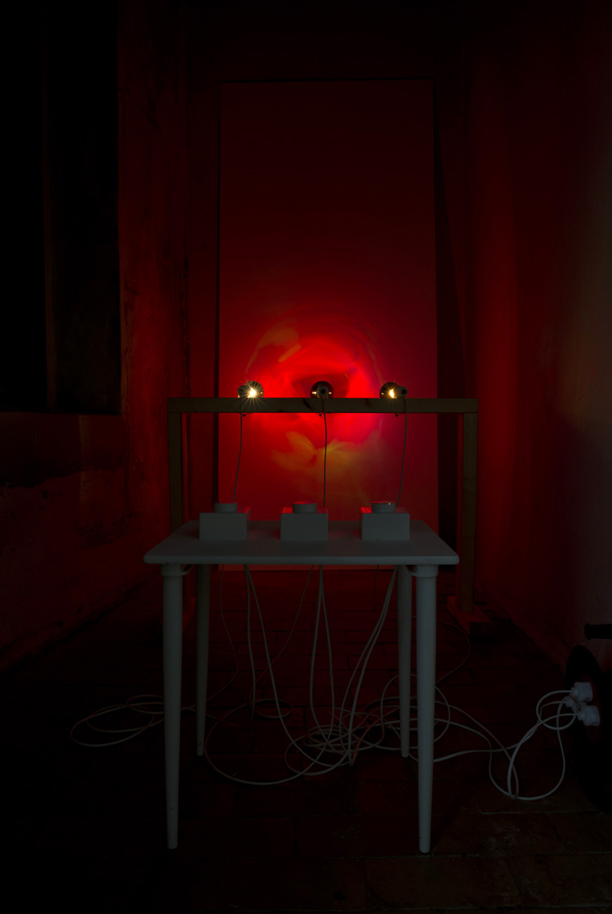 The viewer-participant can create any color by controlling three dimmers. Each dimmer controls a red, green and blue light bulb so that every color can be created by numerous combinations, even white light.
