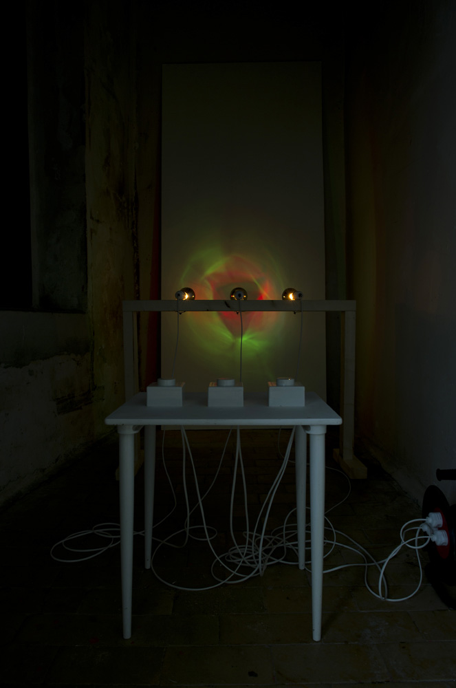The viewer-participant can create any color by controlling three dimmers. Each dimmer controls a red, green and blue light bulb so that every color can be created by numerous combinations, even white light.