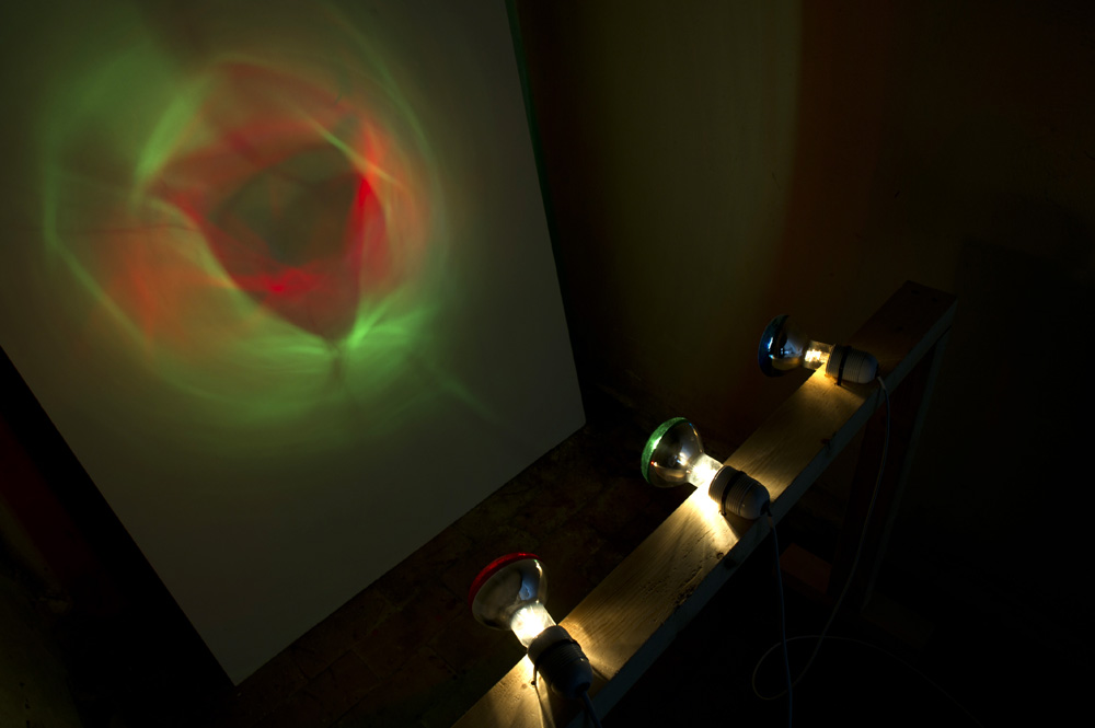 The viewer-participant can create any color by controlling three dimmers. Each dimmer controls a red, green and blue light bulb so that every color can be created by numerous combinations, even white light.