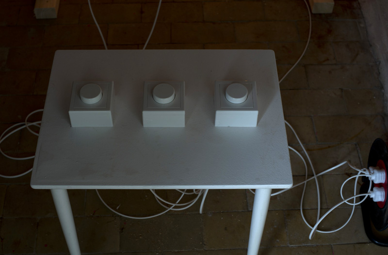The viewer-participant can create any color by controlling three dimmers. Each dimmer controls a red, green and blue light bulb so that every color can be created by numerous combinations, even white light.