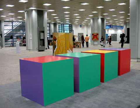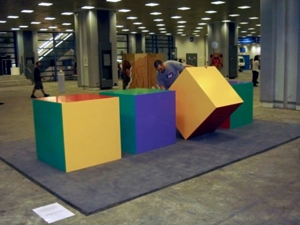 A giant sculptural game, magnified replica of an existing “Rubik’s Cube”-type puzzle.