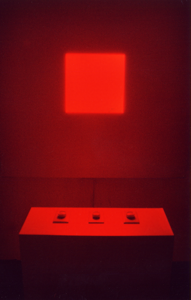 The viewer-participant can create any color by controlling three dimmers. Each dimmer controls a set of red, green and blue light bulbs so that every color can be created by numerous combinations, even white light.